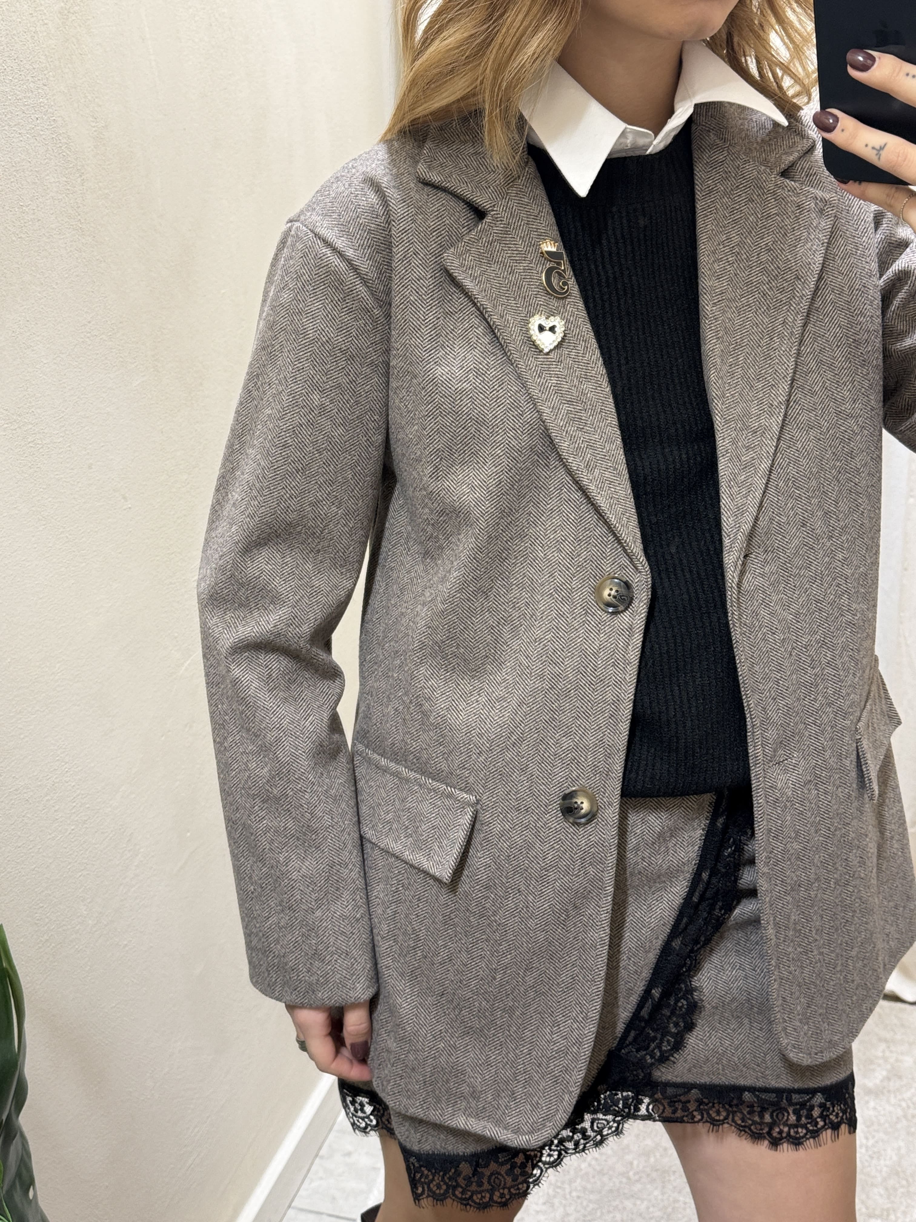Giacca spigata monopetto due bottoni taglio dritto con spille lato cuore removibili. La modella è alta 168cm, veste una 38 ed indossa la taglia S.