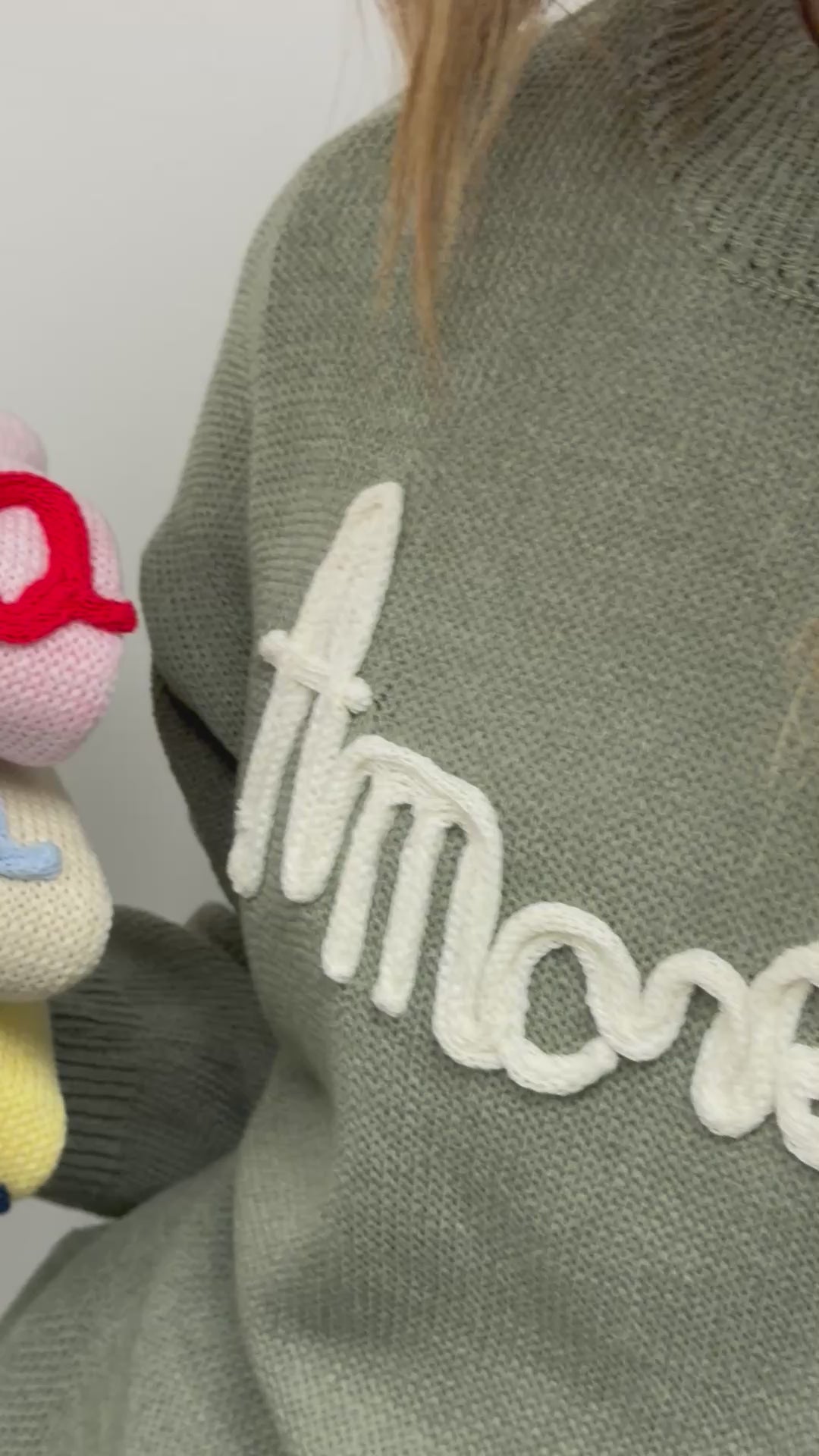 Maglioncino girocollo in misto cotone con scritta “Amore Mio” ricamata con filo colorato, vestibilità regolare. La modella è alta 168cm ed indossa la taglia unica.